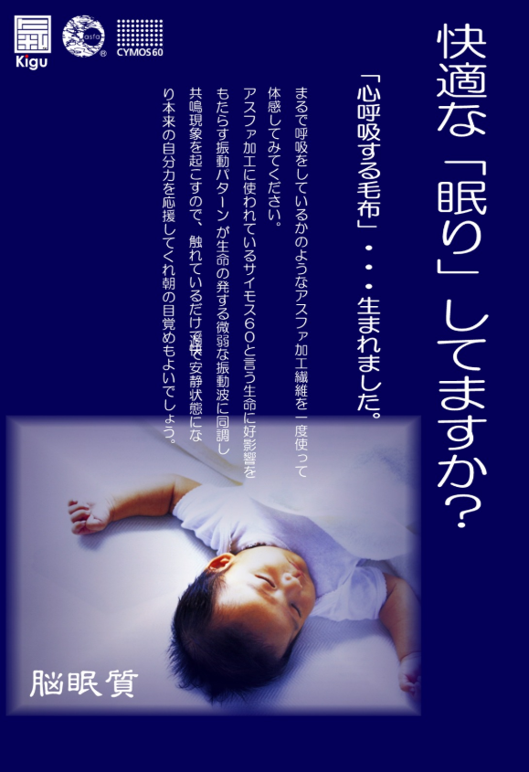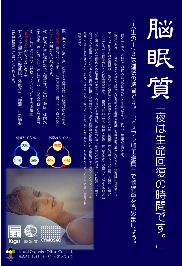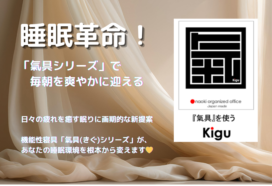 『氣具シリーズ』は、ナオキオーガナイズオフィスが、独自開発したCYMOS60技術とアスファ(ASFA)加工を融合させた次世代の機能性寝具シリーズです。